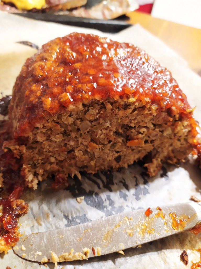Form the dough into a ball and place on the prepared cookie sheet. Form into a “loaf” shape as shown in the pictures. Alternatively, fill bell pepper halves with the lentil mixture and place in a baking dish. Bake for 35 minutes. Remove from the oven and spread the ketchup on top. Sprinkle with sugar to help caramelize the topping. Bake for another 10 minutes. Let the lentil loaf cool at least 10 minutes as it firms up during this time