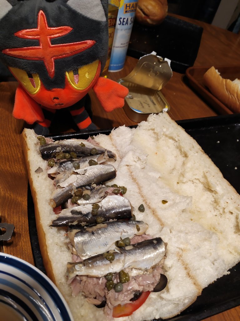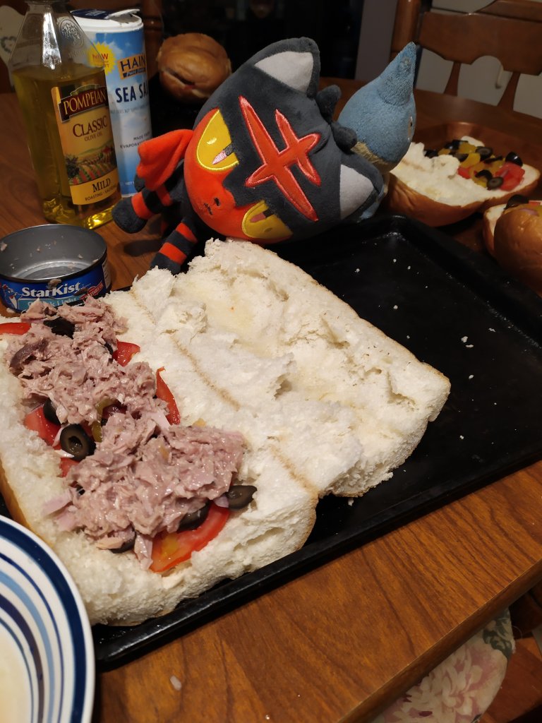 Begin building the sandwich by placing a layer of sliced tomatoes on the bottom half, covering it completely. Season with salt and pepper. Top with sliced onion, olives, and banana peppers. Crumble the tuna over the top, pressing down slightly so it stays in place. Be sure to go as close to the edges as possible. Top with anchovy filets, capers, sliced eggs, and basil leaves. Top with another layer of tomatoes. Season with salt and pepper. Drizzle with vinegar and reserved garlic olive oil.
